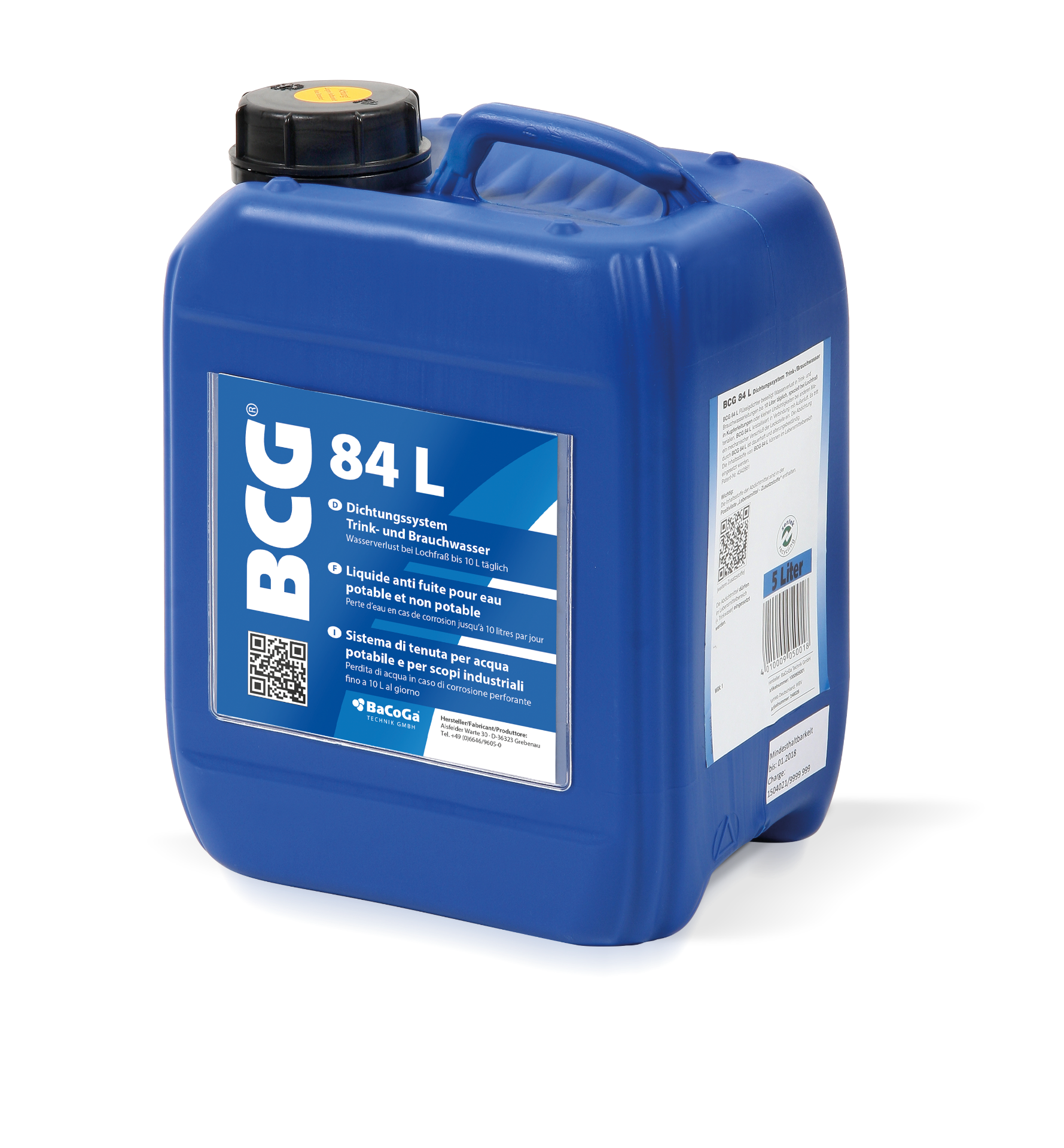 Kapalný těsnící prostředek BCG 84 L odstraňuje ztráty vody v rozvodech pitné a užitkové vody do 10 litrů za den, za konstantního tlaku( +/- 0,2 BAR). Může utěsňovat bodovou korozi, trhliny a netěsná letovaná místa v měděných a pozinkovaných rozvodech a v rozvodech z ušlechtilé oceli a plastů.